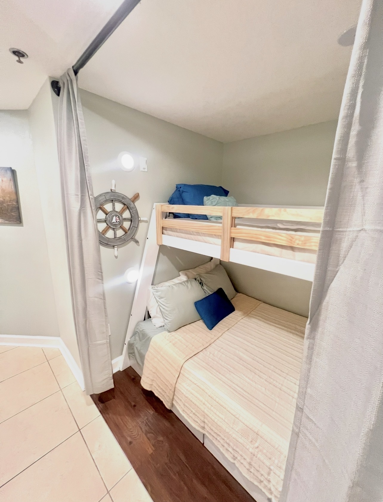 There is a nook area where you will find bunk beds with a twin on top/full on bottom (limit of 100 pounds) plus a cozy living room with a queen sofa bed, - guest have plenty of space to relax.