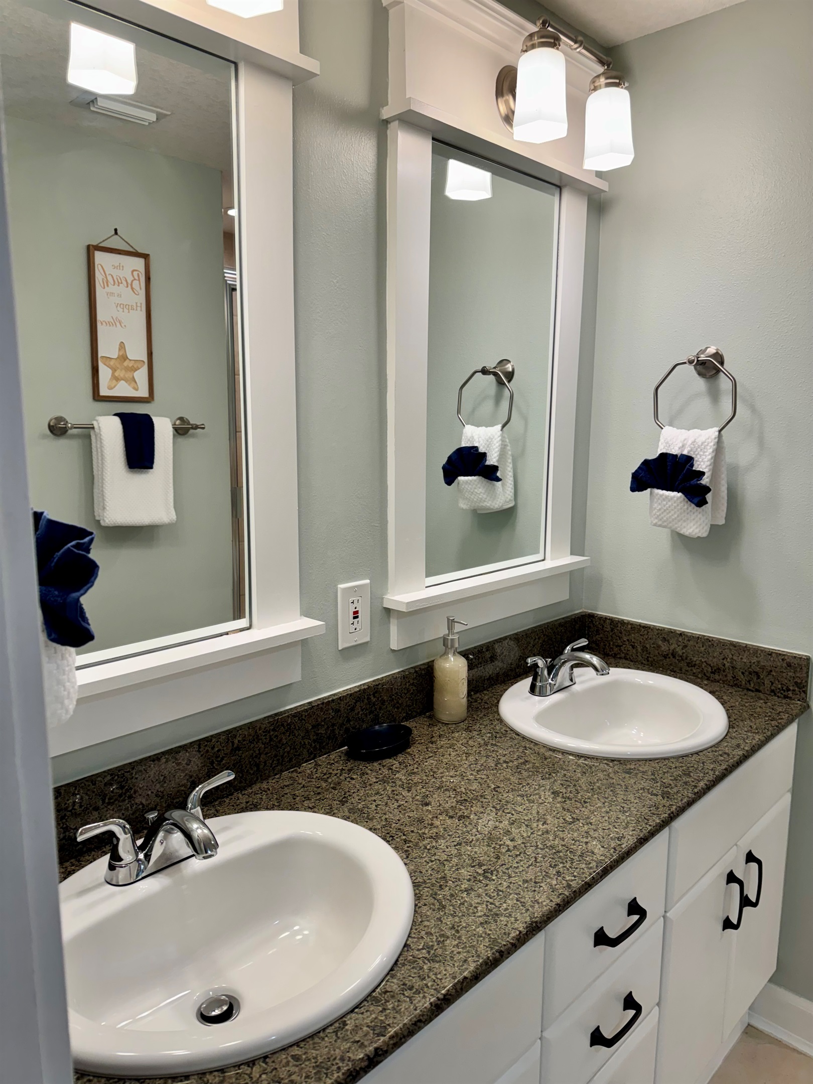 The Primary Bedroom features a king bed, flatscreen smart TV, walk-in shower, separate deep tub, dual granite vanities, great closet space and private access to the balcony. The Guest Bedroom offers a queen bed, flatscreen